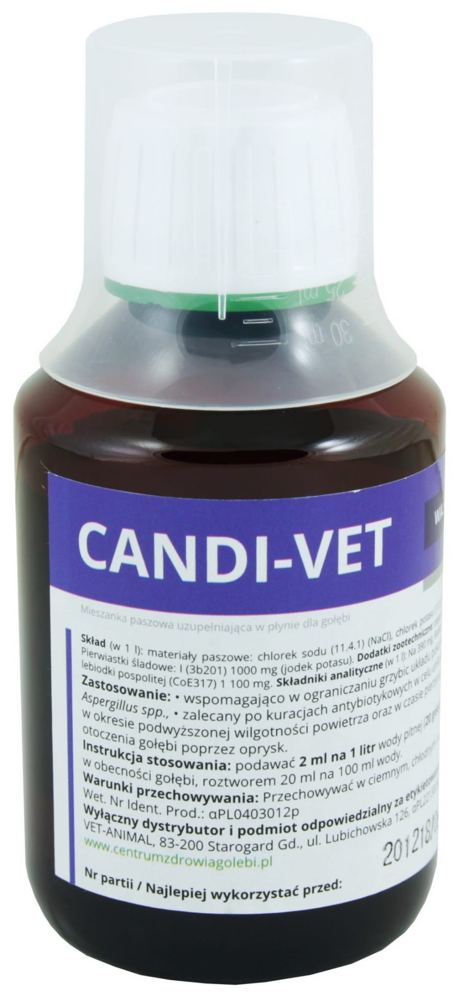 Instrukcja stosowania: Podawać 2 ml na 1 litr wody pitnej (20 gołębi) przez 3-7 dni w zależności od stopnia zaawansowanej grzybicy. Wskazane stosowanie w postaci oprysku gołębnika, można stosować w obecności gołębi, najkorzystniej roztworem 20 ml CANDI-VET na 100 ml wody w spryskiwaczu – swoista, ekologiczna dezynfekcja grzybobójcza.