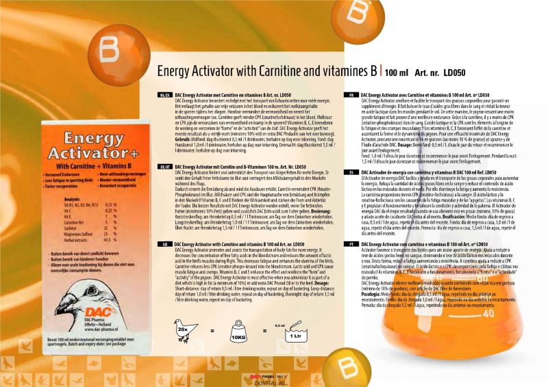 DAC Pharma Energy Activator to niezbędne uzupełnienie dla osiągania najlepszych wyników przez twoje gołębie. Daj im zastrzyk energii, który potrzebują, aby jako pierwsze przylecieć na metę!