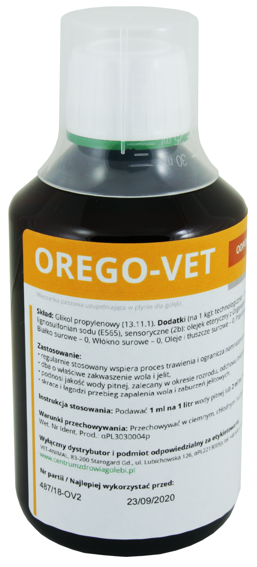 Instrukcja stosowania: Podawać 1 ml na 1 litr wody pitnej (20 gołębi) lub 2 ml na 1 kg karmy przez 3 – 5 dni.