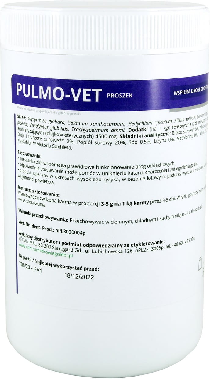 - w okresie lotów, gołębiom dokuczają katary, flegma i patogeny, które upośledzają działanie dróg oddechowych, co niekorzystnie odbija się na wynikach lotowych i aby temu zaradzić należy systematycznie stosować profilaktykę za pomocą produktu PULMO-VET PROSZEK w karmie,