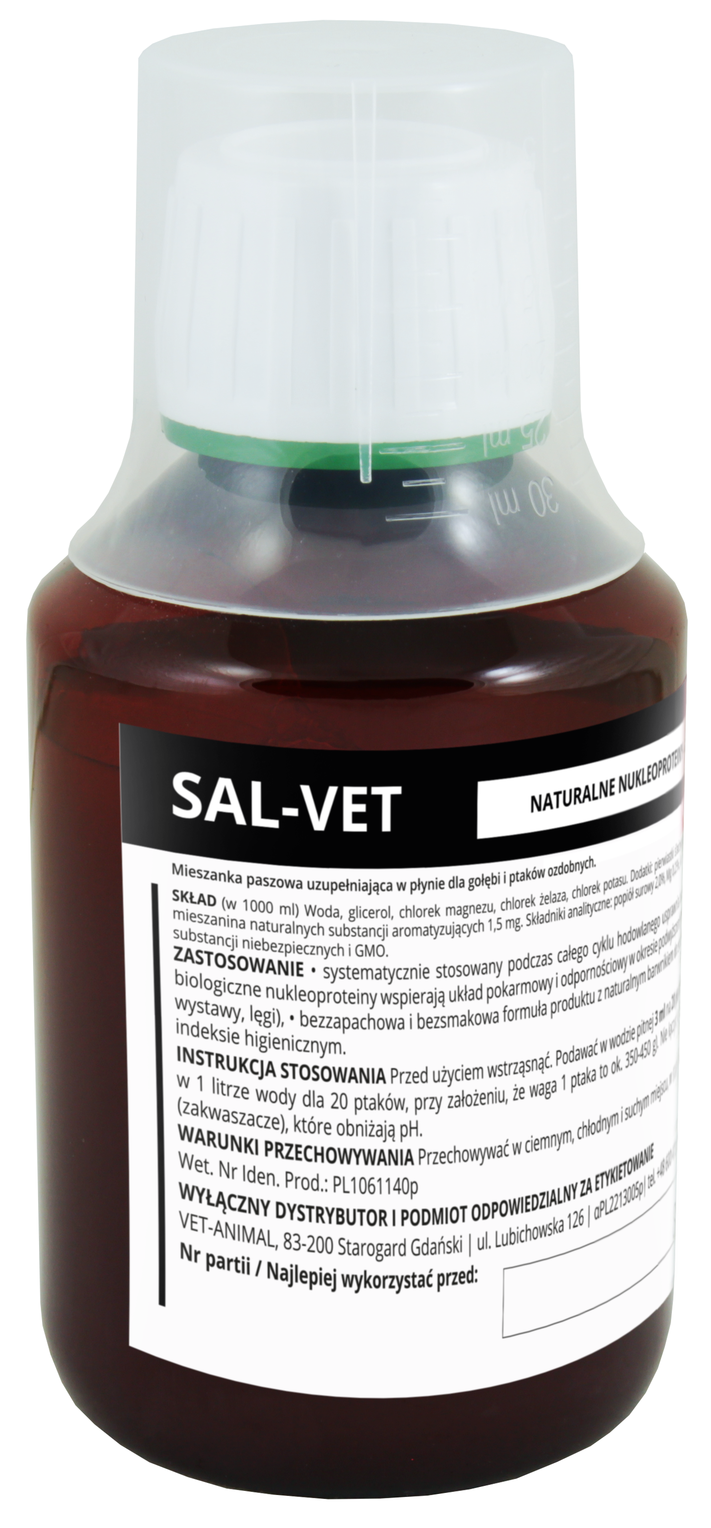 - zawarte w SAL-VET biologiczne nukleoproteiny wspierają układ pokarmowy i odpornościowy w okresie podwyższonego ryzyka infekcji powodowanej przez np. Salmonellę (transport, loty, wystawy, lęgi),