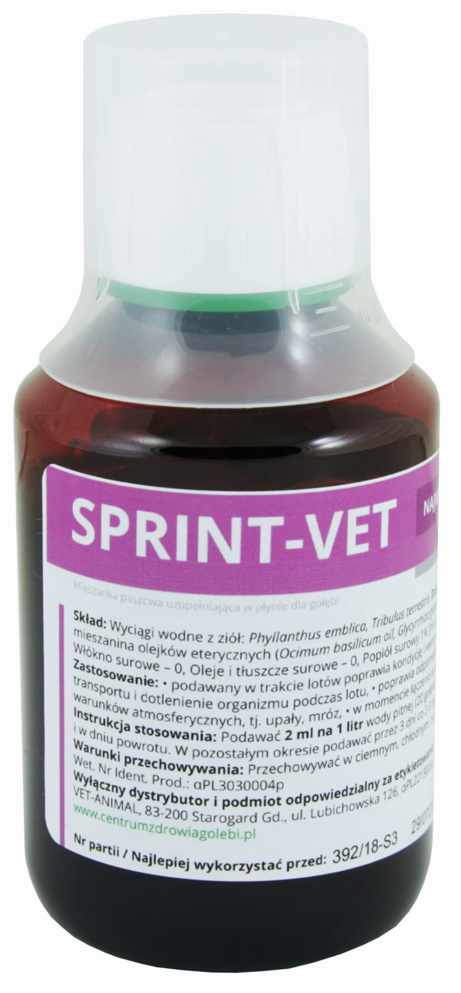 Instrukcja stosowania: Podawać 2 ml na 1 litr wody pitnej (20 gołębi) lub 4 ml na 1 kg karmy 2 dni przed lotem konkursowym i w dniu powrotu. W pozostałym okresie stosować przez 3 dni w tygodniu.